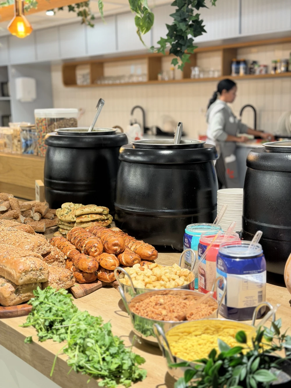 בר מאפים חמים וטריים הנפרסים במקום.